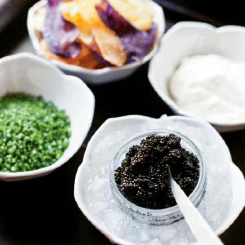 Fill a large heavy pot no more than halfway with oil, and heat to 275°F. When the oil is hot, fry the potato chips in batches, making sure not to crowd the pot, until the chips are golden and crisp. Remove the chips to drain on a paper towel-lined plate and immediately sprinkle with fine sea salt to taste. Serve the caviar chilled in a bowl, surrounded by crushed ice in a larger bowl. Using a mother-of-pearl or other non-metallic spoon for the caviar, invite guests to top their own chips with crème fraîche, a generous helping of caviar, and a sprinkling of fresh chives.