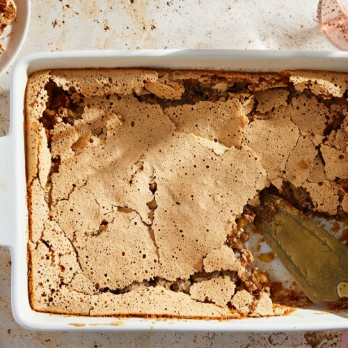 Remove pie from fridge and sprinkle topping over the pear and cranberry mixture.