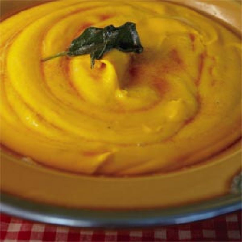 Rub insides of squash with olive oil and sprinkle lightly with salt. Place squash cut-side down on baking sheet with two sage leaves and one garlic clove under each half. Roast squash for 45 minutes to an hour, or until you can squeeze squash and it is soft. Cool.