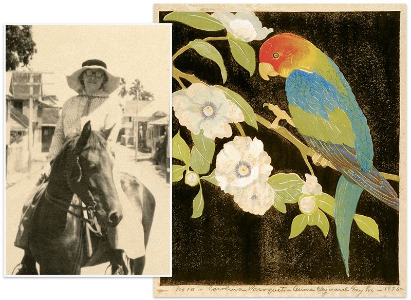 (Left) Anna Heyward Taylor on expedition in British Guiana (present-day Guyana); (Right) Carolina Paroquet (woodblock print on paper, 1935) by Anna Heyward Taylor