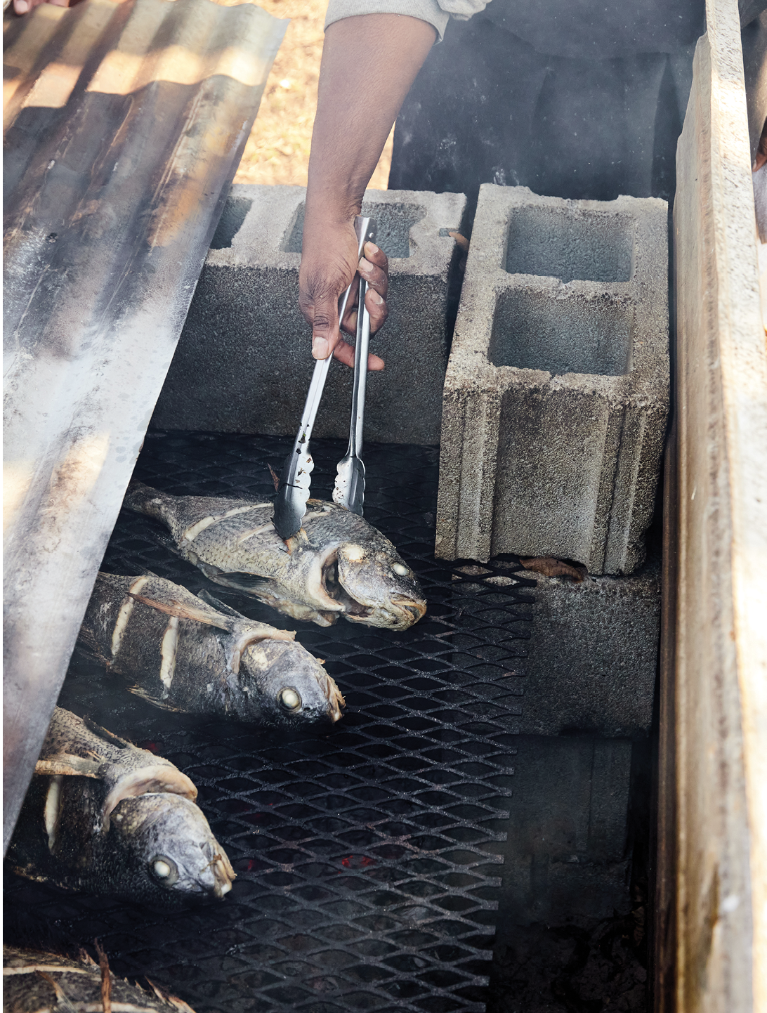 (Left) Chef Dennis’s family and friends at Joseph Fields; (Right) Chef BJ Dennis seasons black drum before cooking them over coals at Joseph Fields Farm on John’s Island.