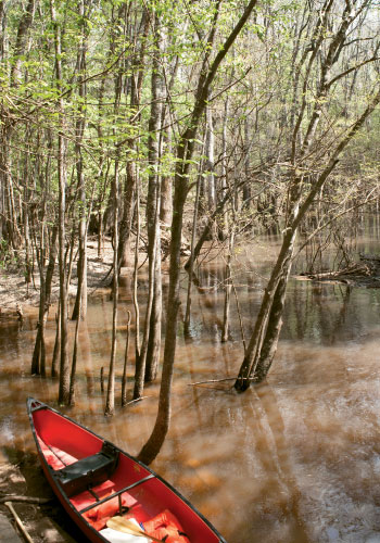 The air was jungle-like. Somewhere, a woodpecker drummed on a tree. Tiny purple flowers bloomed on the bank, and the only man-made sound was the faint whistle of a train somewhere far off. Within five minutes of unloading gear at one of the canoe landings at Congaree National Park, a black racer slipped across a sunny bank of last year’s dry leaves and then disappeared. It happened too fast to get a very good look, but I’d guess the snake was about four feet long.