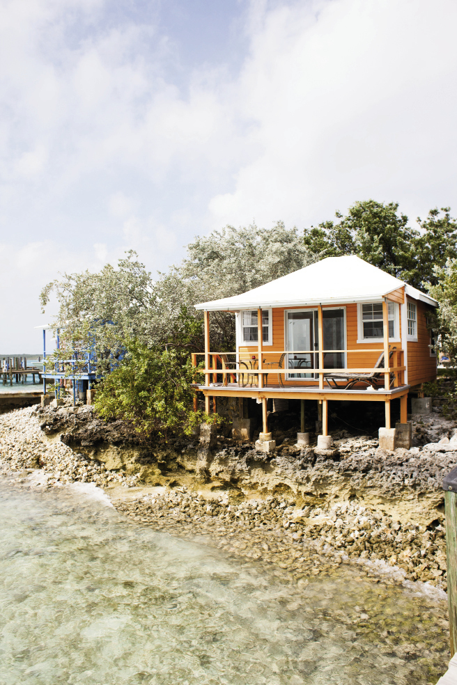 Another bright Exuma day, on another boat, we cruise over to the Staniel Cay Yacht Club, a marina and pub known for its conch fritters. After we eat our fill under rafters hung with nautical flags in every stripe and color, the proprietor, David Hocher, offers to show us a few of the club’s cottages and suites that are available for nightly and weekly rentals. Each is painted and named for a color, including key lime, periwinkle, orange, yellow, and lavender, and some of the cottages are perched directly over the water. The use of skiffs—we saw plenty of 13-foot Boston Whalers—can be included in the lodging rate, with docking just outside.