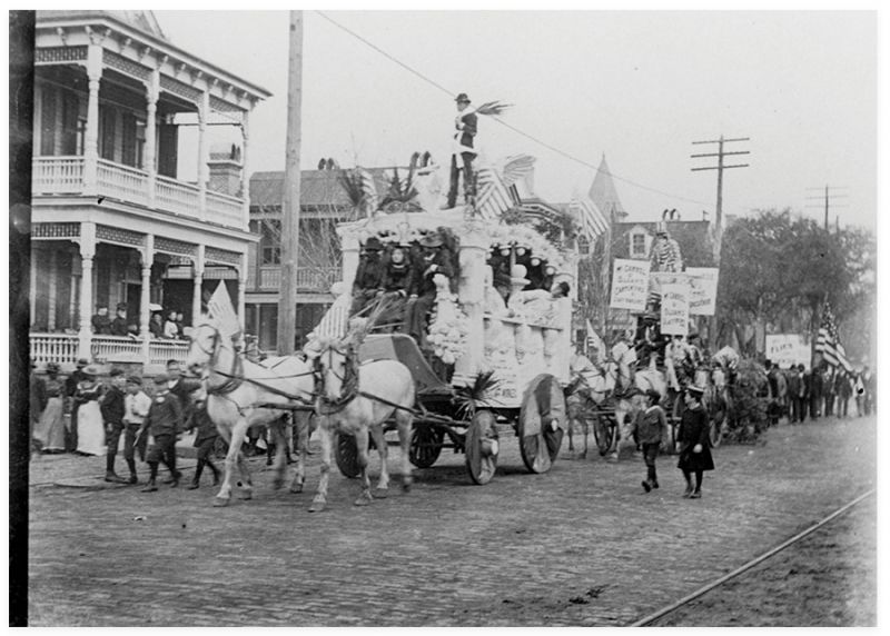 A parade of horse-drawn floats moves through the streets of Charleston on December 1, 1901, kicking off the South Carolina Inter-State and West Indian Exposition. Inspired by world’s fairs in other cities and the desire to stimulate trade through the harbor, a group of progressive young businessmen obtained land north of the city along the Ashley River for construction of temporary buildings and exhibits on subjects ranging from agriculture to transportation. After the end of the exposition, which ran until June 20, 1902, the city acquired the eastern portion of the grounds for use as Hampton Park.