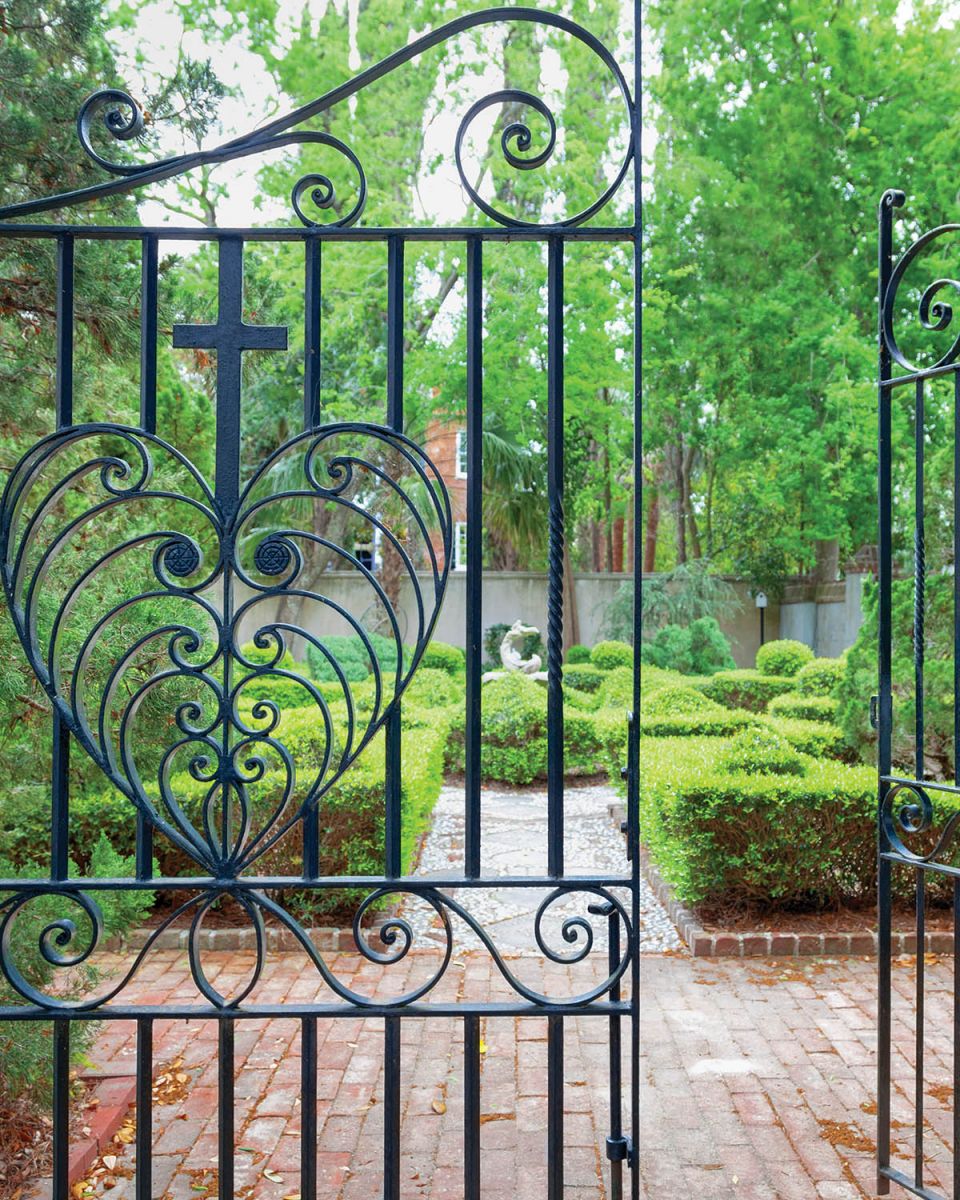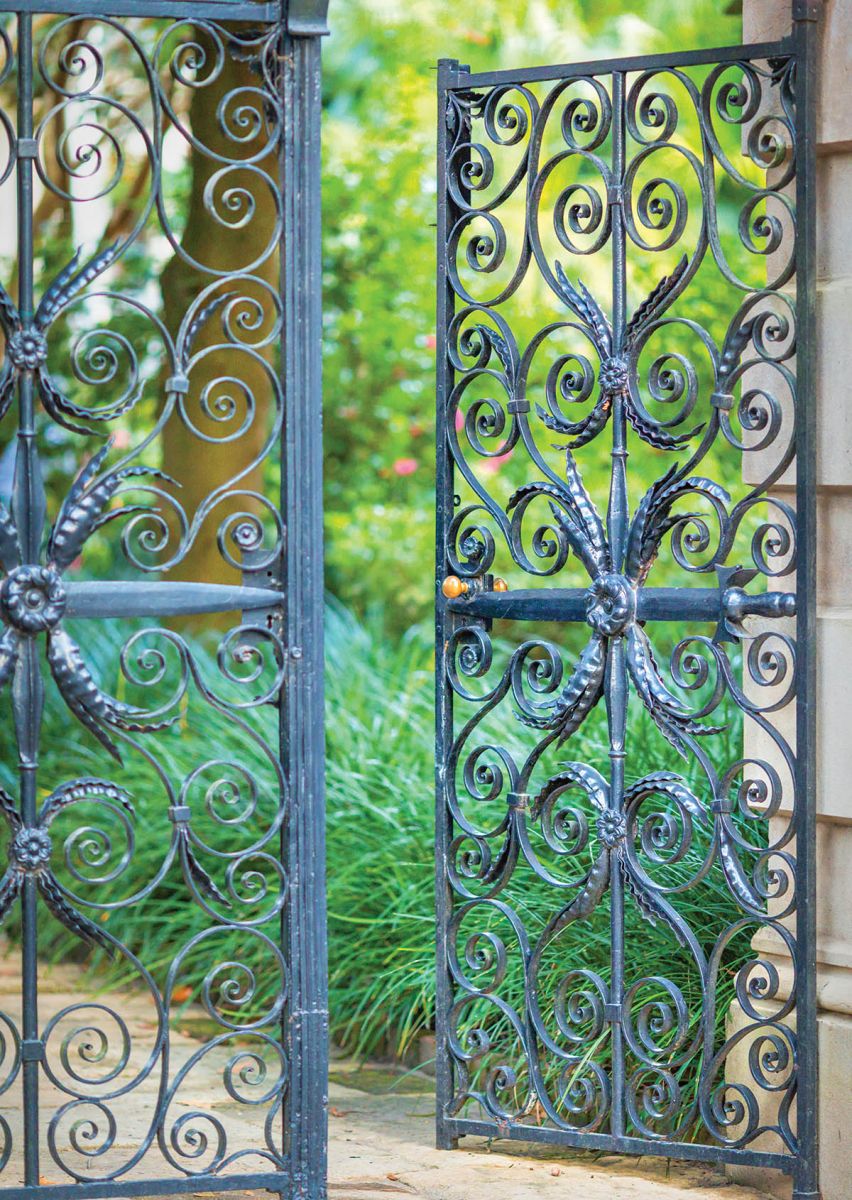 With an intricate design featuring swords and spears, the famed Sword Gates aren’t quite what you’d expect to see fronting a gracious mansion. Crafted by German-born artisan Christopher Werner (1805–1875) in the 1840s, the motif of strength and power was intended for a very different building: the city’s 1830s Guard House, long since demolished. Some accounts say that Werner’s gate was never actually installed at the Guard House, because the city refused to pay its high price. Another story is that, confused by the phrase “pair of gates,” Werner erroneously crafted two pairs—and the spare one went to Legare Street.