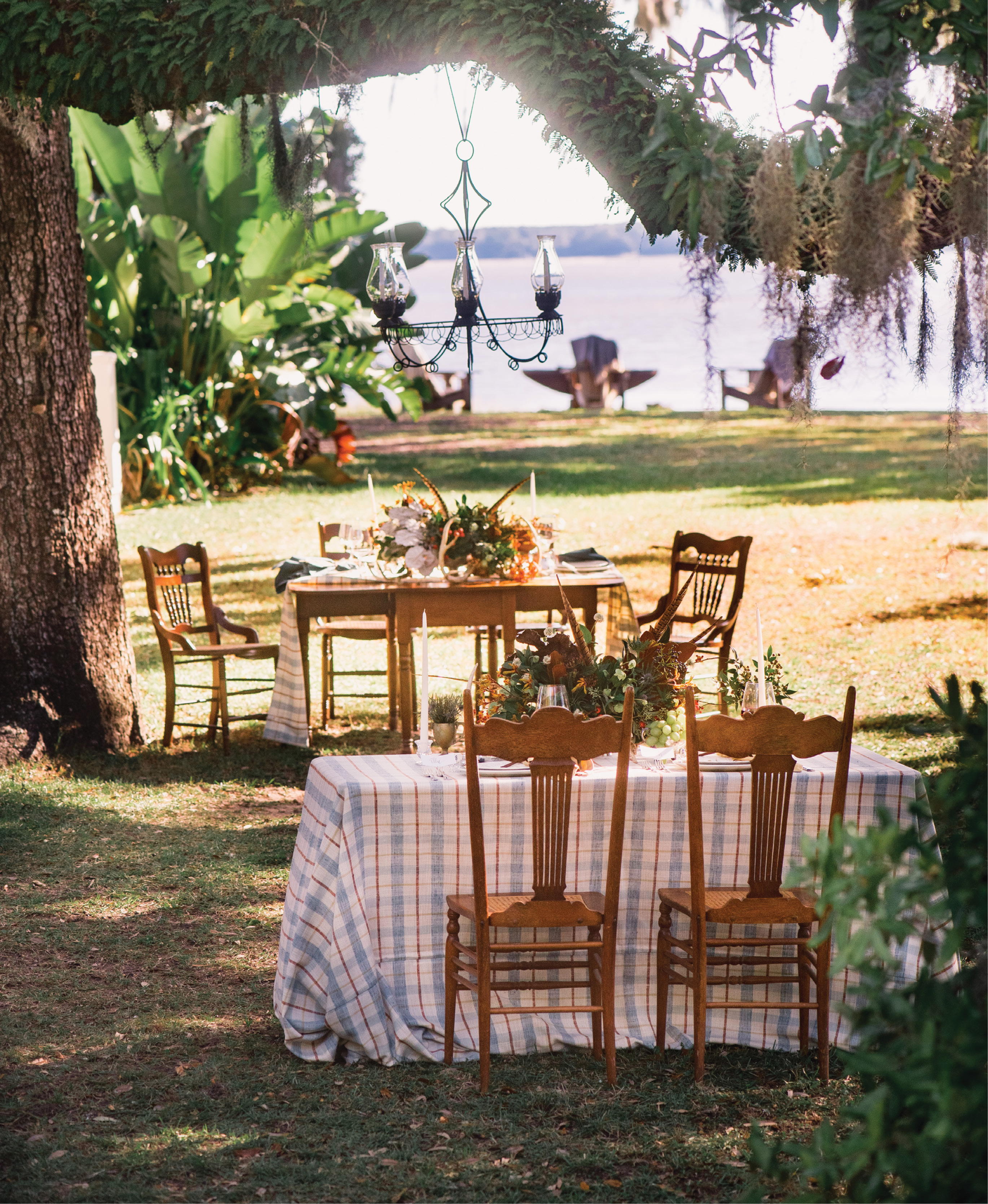 Then the younger generations pack up their fare and head for the country, where the hosts have brought the dining room outdoors. A table for the grandparents sits seven feet from one for their brood. “It’s still close enough to promote easy conversation,” assures Williams. She dressed the tables in plaid linens, bird-adorned china, and family silver. Antlers and feathers collected over the years join bowls of fruit in accenting the floral centerpieces.
