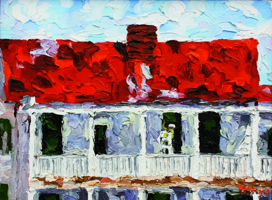 Growing up in the Lowcountry made a deep and lasting impression on Corrigan, who says she’s still inspired by changes in the landscape. “The sparkle of light on the water excites me. Nothing here is static—everything moves. Even the sky is alive.” She captures that liveliness mostly in oil now, employing vivid colors and loose brushstrokes that put her paintings somewhere between Impressionism and Expressionism. Corrigan says she draws from a variety of influences, including van Gogh and Matisse, as well as an endless stack of books that spills from the shelves lining the narrow staircase of her home.