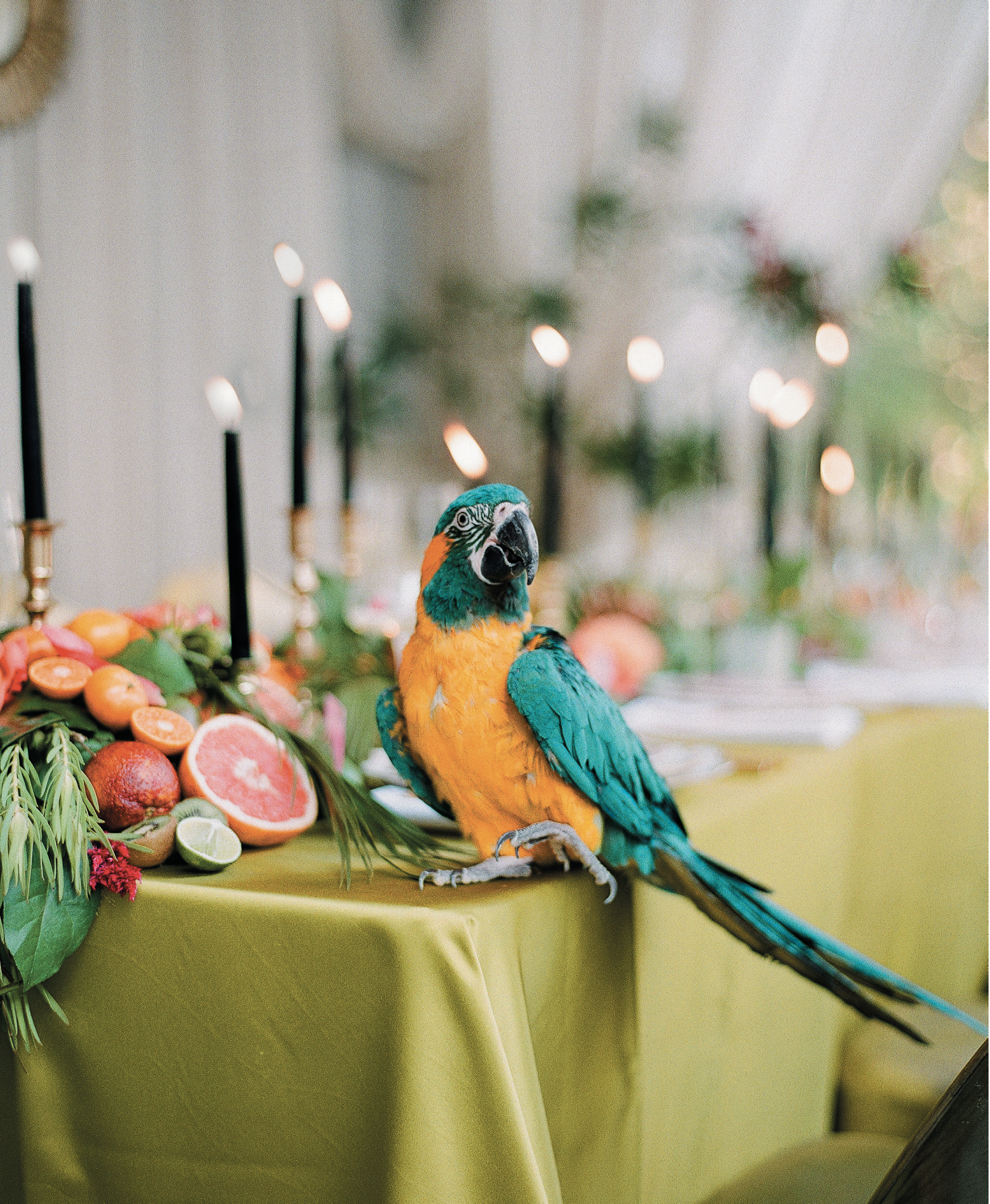■ Work the color wheel. Kristin suggests letting something as simple as a palette of colors guide you. “That chartreuse linen was everything,” she says, adding that the rest of the tablescape was designed around it.