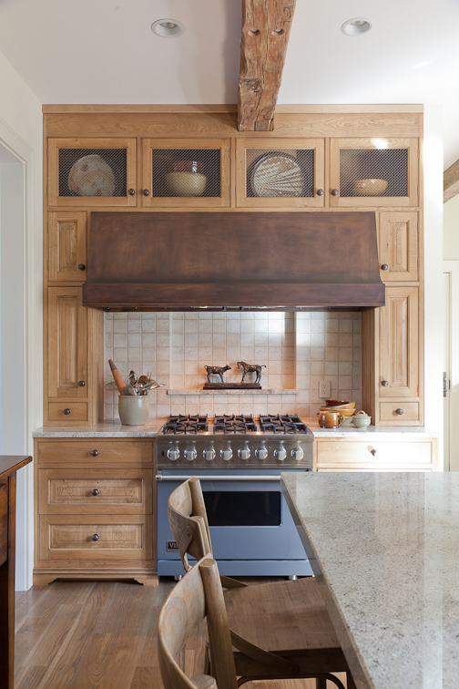 Interior designer Regina Garcia advised the couple throughout the planning and construction. “Their vision was always there,” Garcia says. “But I became part of the team, someone to collaborate with.” When it came time to design the kitchen, Garcia’s expertise was particularly useful. She encouraged the women to go with a double-entrance on the family-room side, rather than a single doorway, to maintain flow. She also advised that they eschew built-ins in favor of what she refers to as a freestanding, furniture-style kitchen. “I wanted it to look like something that had developed over time,” she explains. The farmhouse sink is flanked by armoires of Garcia’s own design, which were custom-built with oak harvested from trees that had already fallen; they look well-loved and fit right in with the rest of the house. And the copper stove hood was handcrafted by a local artisan, Randy Crosby of A&R Sheet Metal, then stained with a chemical to make it look aged. Vintage pendant lanterns and hardware made from natural bronze complete the lived-in vibe.