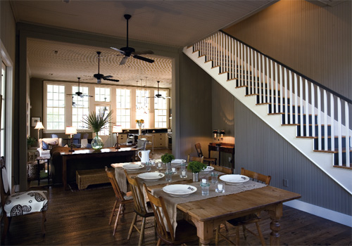 As a child, Gale Thompson spent long summers on Edisto Island. Her family’s circa-1880 plantation house, better known as “Sunnyside,” served as the clan’s quiet country retreat for as long as she can remember. So it’s no wonder that when she and her husband Bill decided it was time to build their own haven on their property at Edisto, they set out to find something historic to remake into a home. “I wanted something old,” says Gale. “It would have been hard for me to go from that old plantation house to something brand new.” She knew about an old schoolhouse constructed on the island in the 1920s—after all, she’d been in and out of it since she was a child. “It was a neat building, and the interior had a lot of integrity,” says Gale. The couple felt that the structure, used as a black schoolhouse until around the 1950s, had great bones and incredible potential—and it was conveniently just down the road on land once owned by Gale’s great-grandfather. Upon purchasing the house, the couple brought their project to Palmetto Craftsmen, Inc., a company that specializes in historic restorations. Hunter McEaddy Dawson, a cousin of Bill’s, took charge of the architectural challenges inherent in transforming a building from schoolhouse to home, and the year-and-a-half long process began. Not So Elementary… First up: moving the building from its present location to the Thompsons’ property, a stretch of land fronting Store Creek. In addition to all the considerations required to move such an old building, they also had to work closely with the Department of Transportation to ensure no old trees or other natural habitats were disturbed along Highway 174. “It’s a little bit more involved than I think most people realize,” says Bud Hay, vice president of Palmetto Craftsmen. As for the the actual transformation, “We had to take something that was nearly 100 years old and bring it up to modern building codes,” says Hay. “There was no electricity, no plumbing, no heating or air. All of that had to be added.” For Gale and Bill, one of the most important parts of the restoration was maintaining as much of the original fabric of the building as they could. All 12 windows on either side are original to the schoolhouse, along with the yellow pine floors and much of the beadboard on the walls and ceilings. When parts of the walls or ceiling had to be removed, as was the case in creating a hole for the stairs, they reused that beadboard in other areas of the home. Liveability and comfort were also key factors for the Thompsons, who have two daughters, Bel, eight, and deRosset, six. And fortunately the building had plenty of room to create a second floor, which was converted into two bedrooms and two bathrooms, along with a playroom, for the girls. They even saved some of the original chalkboard frames (the slate had long since been removed), so that each would have a drawing space over her bed. “The girls love the chalkboards,” says Gale. “They play tic tac toe, and we have fun leaving each other notes.” But Gale’s favorite additions to “the schoolhouse,” as the family now affectionately refers to it, are the porches, which stretch some 60 feet around two sides of the home. “I knew I wanted porches with French doors all the way across,” says Gale. “I wanted to bring the outdoors inside.” Scholarly Simplicity Gale brought in friend and interior designer Kimberly Glenn, owner of Kimberly Glenn Interiors, to help her achieve a clean, uncluttered look that would serve as a comfortable refuge the entire family could enjoy. “We wanted the schoolhouse to stand out, not the décor,” says Glenn. “I didn’t want to take away from the architecture of the building.” They chose a pluff mud color for the walls, accented by splashes of hydrangea blue on pillows and chairs, and used lots of chocolate browns and other earth tones in keeping with the natural theme. And rather than putting a heavy emphasis on new acquisitions, they chose a few memorable pieces, such as the old chopping block that sits near the kitchen, a carryover from Seewee Supply, a general store that Gale’s great uncle once owned, or the red trunk in the master bedroom culled from her parents’ house up the creek. For Gale and her family, the home is all about giving new life to something old and exposing a new generation to the joys she knew as a child growing up on the island. “Edisto is a part of our lives,” says Gale. “I want my girls to know the island and love it.” And what better education than from inside the walls of academia itself?