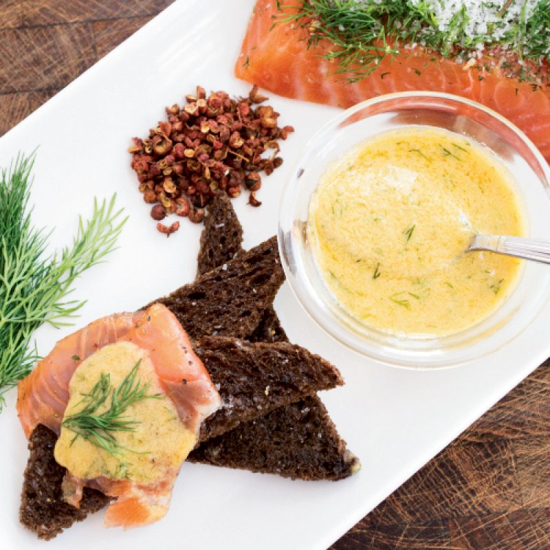 ❾ Separate the fish into two halves. Scrape and discard any excess cure and rinse lightly. Pat dry.