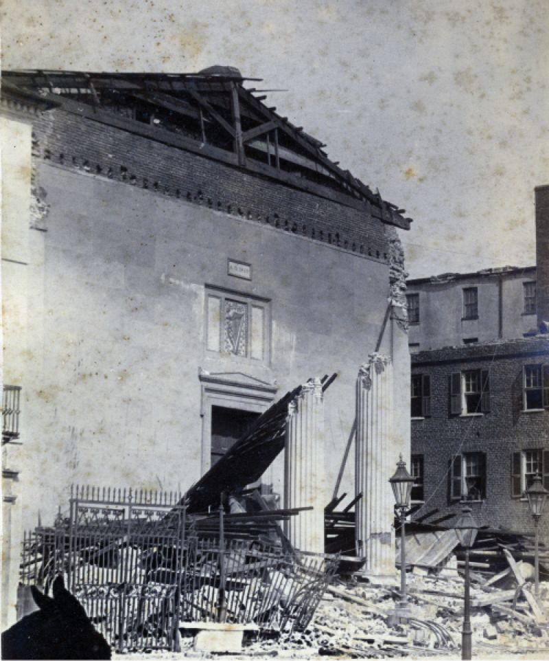 Hibernian Hall (pictured here the day after the huge quake) was one of many damaged local structures. The circa-1841 Greek Revival building with a three-story interior rotunda was designed by Philadelphia architect Thomas U. Walter, who later designed the Capitol dome in Washington, D.C. Following the disaster, the portico was rebuilt with alterations to the columns, and “a more elaborate modillioned cornice and an Italianate window” were added to the exterior, as cited in Jonathan Poston’s local architecture bible, The Buildings of Charleston. However, the majority of its original interior remained intact.