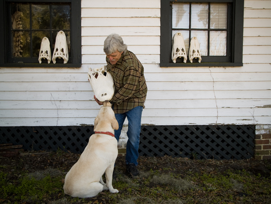 Yes, bones. They’re everywhere here. Alligator skulls, manatee ribs, a whale sternum. Mayes has completed commissions for three articulated and mounted alligator skeletons—for Dewees Island Nature Center, Edisto Beach State Park Interpretive Center, and a restaurant in Las Vegas—and one pygmy sperm whale skeleton, also for Dewees.