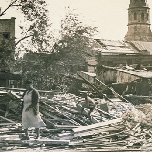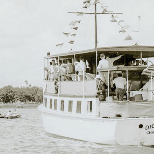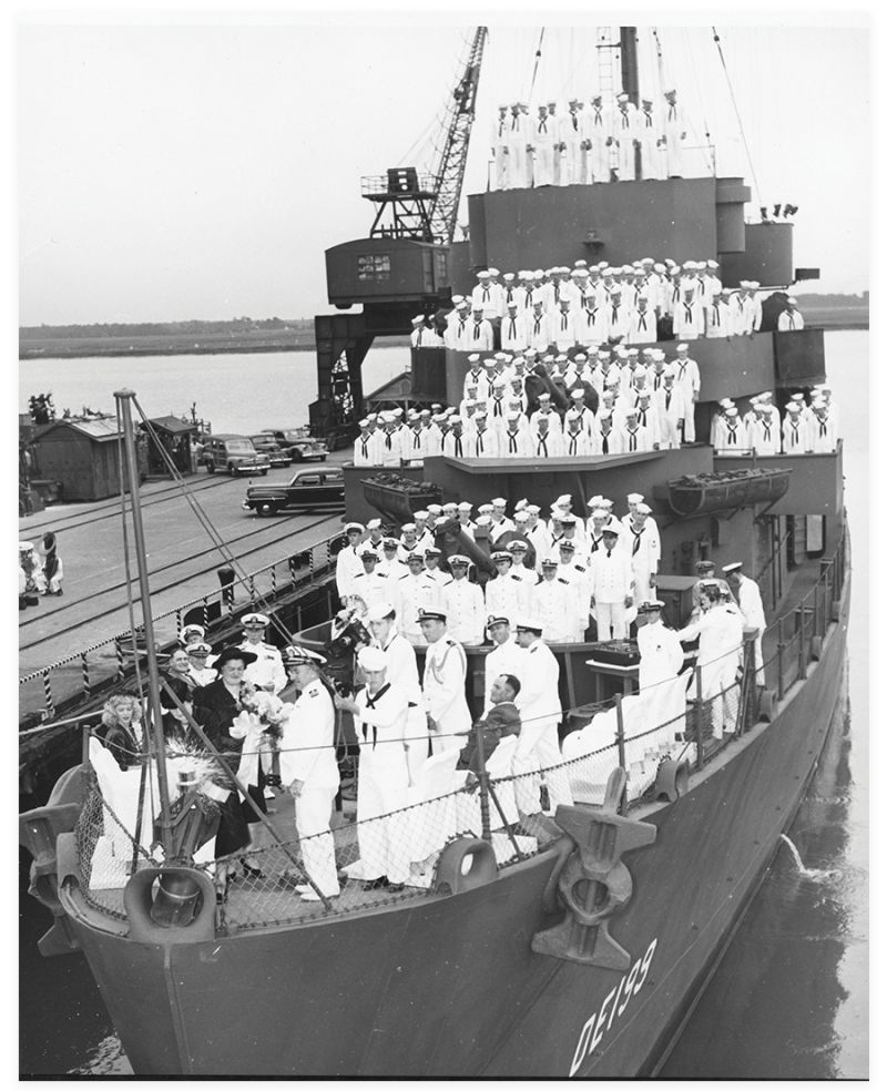 Rows of uniformed officers and sailors stand at attention during the christening of the USS Manning in this image taken on October 1, 1943. Named in honor of an ordnanceman killed in action during the Japanese attack on Pearl Harbor, the Buckley-class destroyer was one of 245 vessels built at the Charleston Naval Shipyard from 1901 until its closure in 1996. Manning sailed for Pearl Harbor on December 12, 1943. For four years, it escorted convoys through waters surrounding the Solomon Islands, New Guinea, and the Philippines until being decommissioned in San Diego on January 15, 1947. The vessel, which received four battle stars for its World War II service, was declared unfit for use in 1968 and sold for scrap to the National Metal & Steel Company the following year.