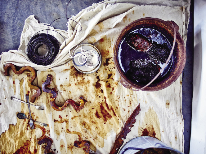When she first began to visit the Whaley Street studio, Magar noticed the sound of trains that frequently chug across this part of downtown Columbia. The mill workers must have heard this too, she realized. On a visit to the tracks, she found bent and rusted rail spikes and other scrap metal and brought those pieces to her dyeing vat, first winding each tightly in fabric. When unwound, the fabric is tracked with lines and color from the rust. All of this is simple and basic, she says, like the mill village life itself.
