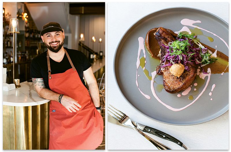 (Left) Chef Shaun Brian infuses Parcel 32’s menu with nods to his Caribbean heritage. (Right) A pork chop is served with spicy purple slaw and a heaping dollop of apple-persimmon butter for good measure.