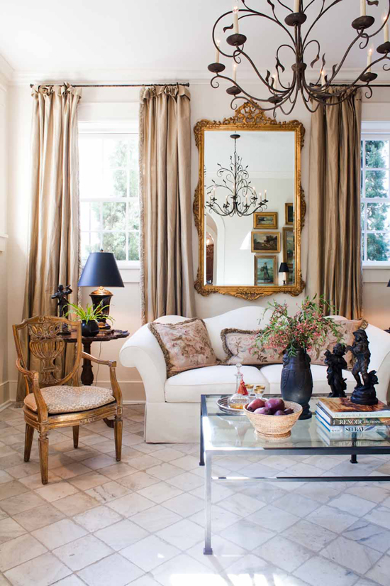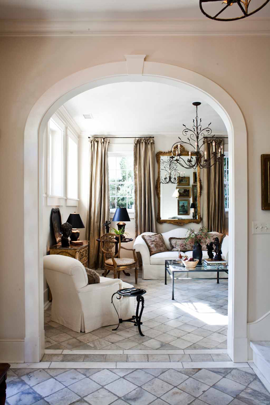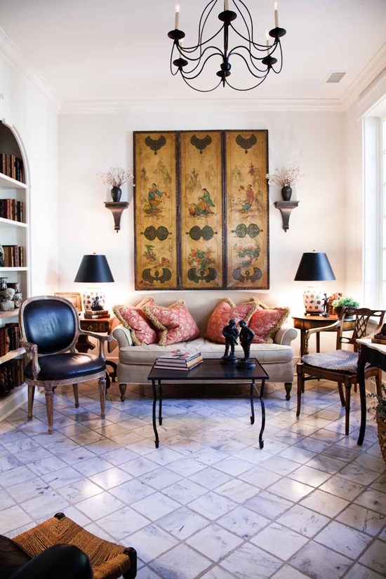 In 1996, they moved in and, almost a decade later, enlisted Beau Clowney Design to oversee phase two, which entailed creating a marble bath off the upstairs master bedroom, widening the entry between the music room and library, putting a wall of windows between the library and garden, re-stuccoing the exterior, removing rotting wood, and retreading the stairwell with marble. The end result is a roughly 3,400-square-foot home with well-proportioned rooms that mimic the scale and volume of the original spaces. Styling-wise, Pinky employed a light touch, keeping things neutral to amplify the sunlight that pours in from the horse-stall windows, just high enough to make window treatments unnecessary. And with input from interior designer daughter Meredith, she’s filled it with favorite pieces from homes past—antique leather books and a vast art collection that includes pieces from those near and dear: her Aunt Francys, daughter Ashley, son-in-law John Dunnan, and one drawing of her own.