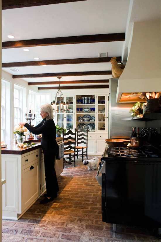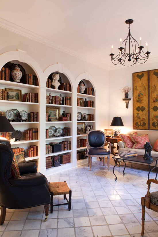 Pinky’s delight bubbles forth as she walks through the place, explaining how the house originally included the arched, streetside entry door (tall enough for horses to pass through), stalls to the right and left, and a center stairway up to a second floor of three small rooms. The Warings added a dog-legged, adjoining kitchen (where the library now stands) with a bedroom above and a loggia where the kitchen is now situated.