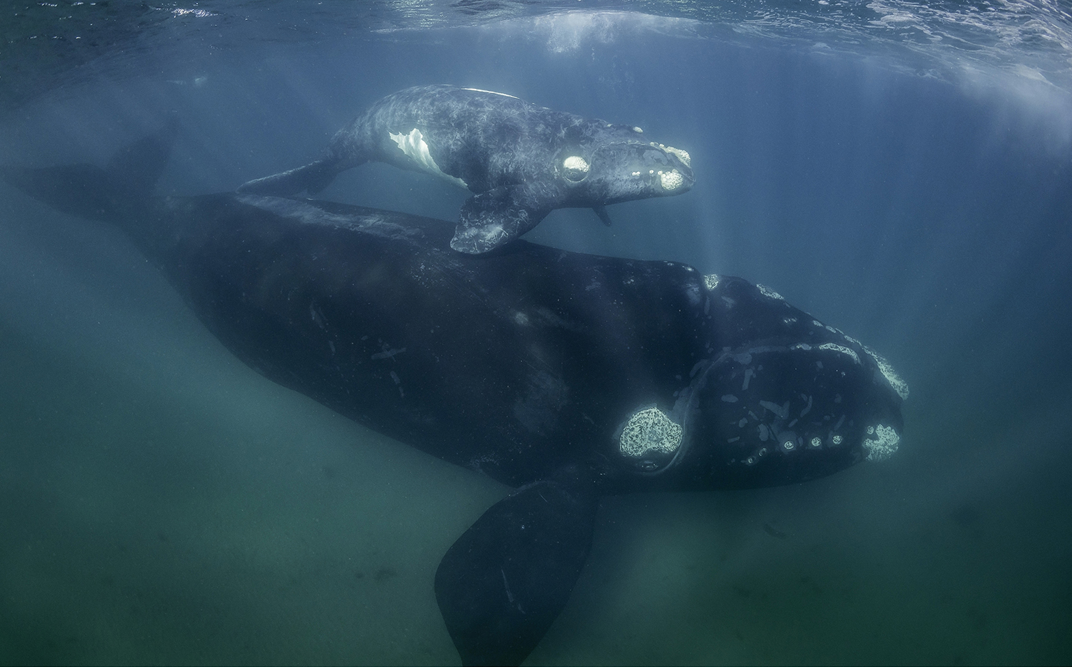 A massive right whale mama and her calf; Read more about these mammals at fisheries.noaa.gov/ species/north-atlantic-right-whale. Range: Once common on both sides of the North Atlantic, they’re now found primarily in the western North Atlantic, from winter calving grounds off Florida and Georgia to summering grounds in the Gulf of Maine, Bay of Fundy, Scotian Shelf, and Gulf of Saint Lawrence.