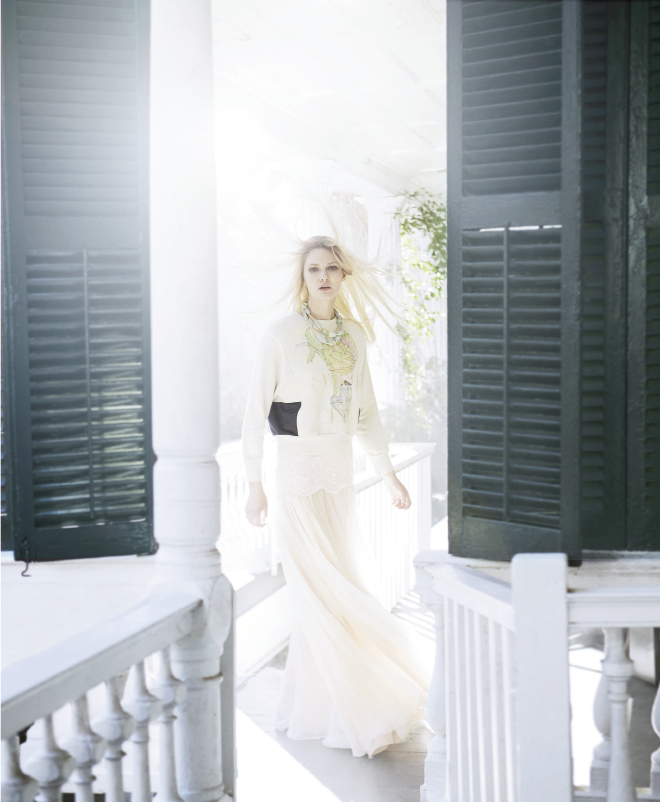 THROUGH THE LOOKING GLASS Dolce & Gabbana printed tunic, $1,495, and printed maxi skirt, $1,595, available at dolcegabbana.com; gold bug and pearl necklace, $450 at Croghan’s Jewel Box; Loren Hope “Alex” antiqued brass cuff, $68 at Copper Penny; Ziio serpent bracelet with lapis, turquoise, and pearl, price upon request at RTW