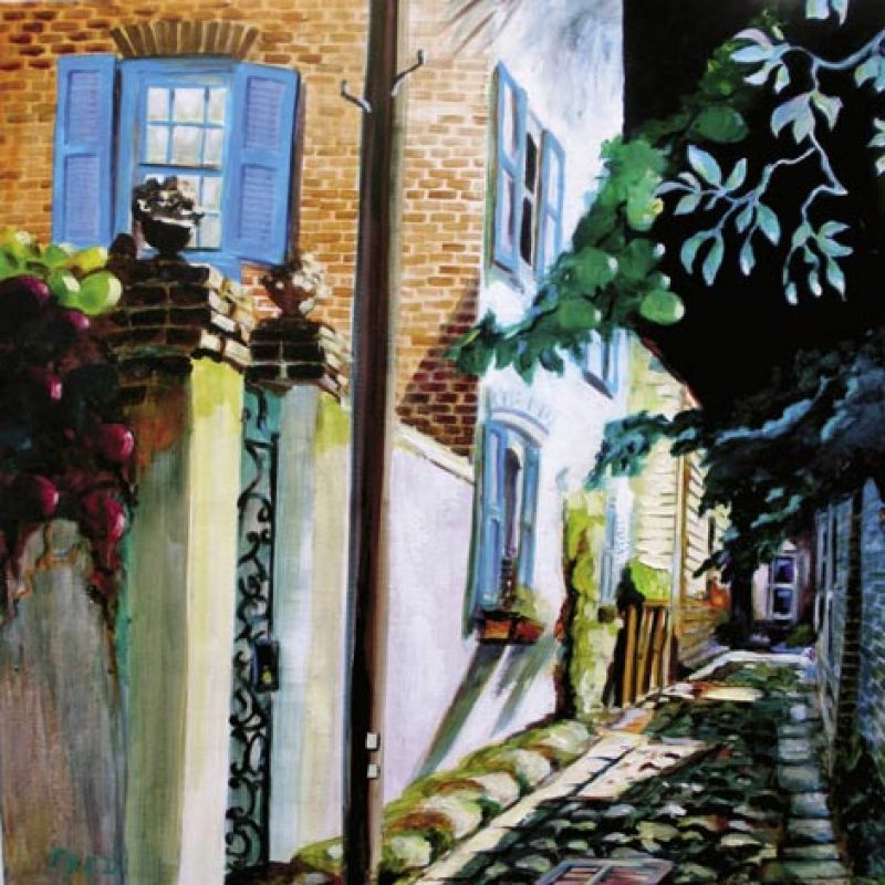 I found them, the small crevices and tiny byways, as I was walking along East Bay with a loud distressed baby and was desperate to take cover, to duck into shade. I’d passed by the small openings that mark Longitude Lane and Stoll’s Alley many times before, but had been so focused on the main drag’s impressive homes and landmarks that I barely noticed them. But there, hidden from tourists and traffic, I discovered the whispered welcome of Charleston’s tucked-away lanes, the allure of her overlooked alleys, the way their cool quiet beckons, like a secret waiting to be revealed.