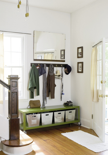 In came pieces she’d found, made, or spiffed up over the past few years, plus some new stuff—a low-slung sofa from CB2, a pair of blue, fiberglass Eames reproduction chairs, a stainless-steel kitchen island from an online restaurant supply shop—mixed in to shake and shine things up. But mostly, the trappings are Ann Ladson’s made-over versions: a pair of plain-Jane benches decoupaged with canvas paintings, a trunk John’s grandmother took with her to boarding school now outfitted with metal casters and put to use as a coffee table, a poster from a 1950s schoolroom mounted on a plastic pull-down shade in the dining room.