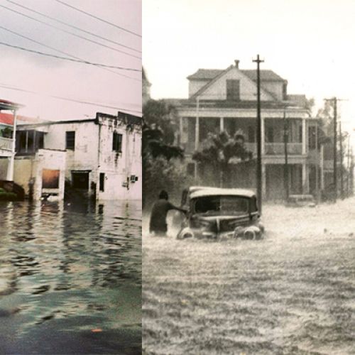(Left to right) Two men wade at the corner of Meeting and South Battery streets after a 1940 hurricane turned White Point Garden into a waterway; The flooding of local roadways, whether from storms or king tides, is a regular hazard. NOAA’s Office for Coastal Management reports that nuisance flooding is more than twice as likely to occur as it was in 2000 and that rate could double or triple by 2030.