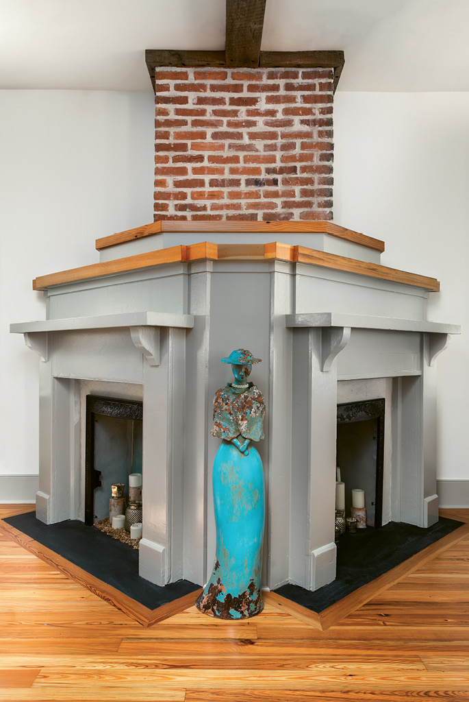 Under his guidance, they embarked on a preservation-minded renovation—no small task given the home’s condition. “We saved as much as we could,” Cindy notes. But much was beyond repair, including most of the oak and heart-pine floorboards. “Marc did everything he could to save them,” she adds. “He even pulled the wood up, took it outside, and left it in the rain and sun, hoping that might help. But the smell had just permeated it all.” Heart pine salvaged from another Engelke project made for a reasonable substitute.