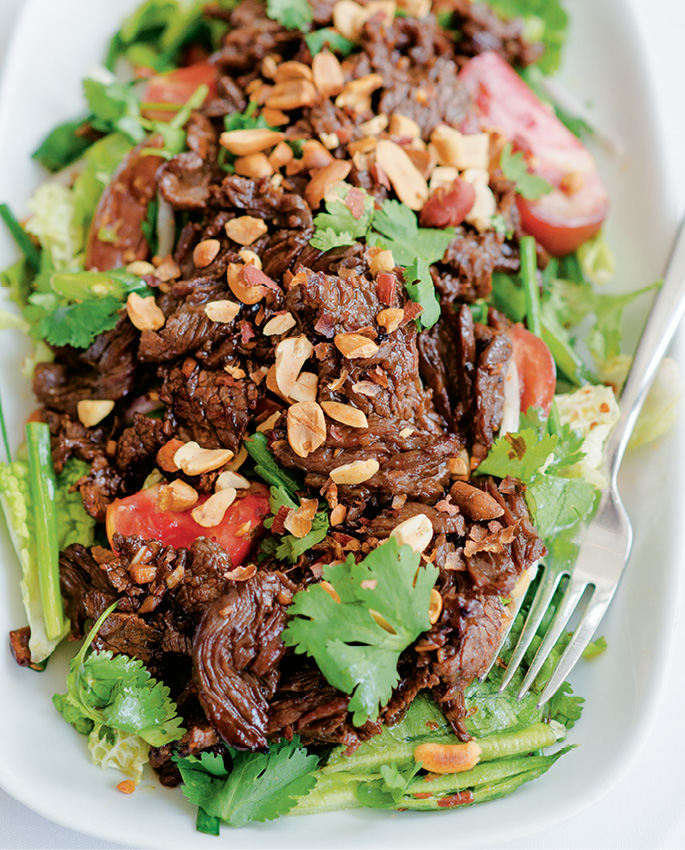 The chef can’t resist sharing his love for Asian cuisine, proving his chops with high-heat know-how. Calling for flank steak—a “not-as-tender cut from a highly used muscle group that results in medium-low fat content with plenty of flavor”—Cook sears the meat in a scalding-hot wok and complements it with a cool, complex Thai salad. (Find this recipe at charlestonmag.com.)