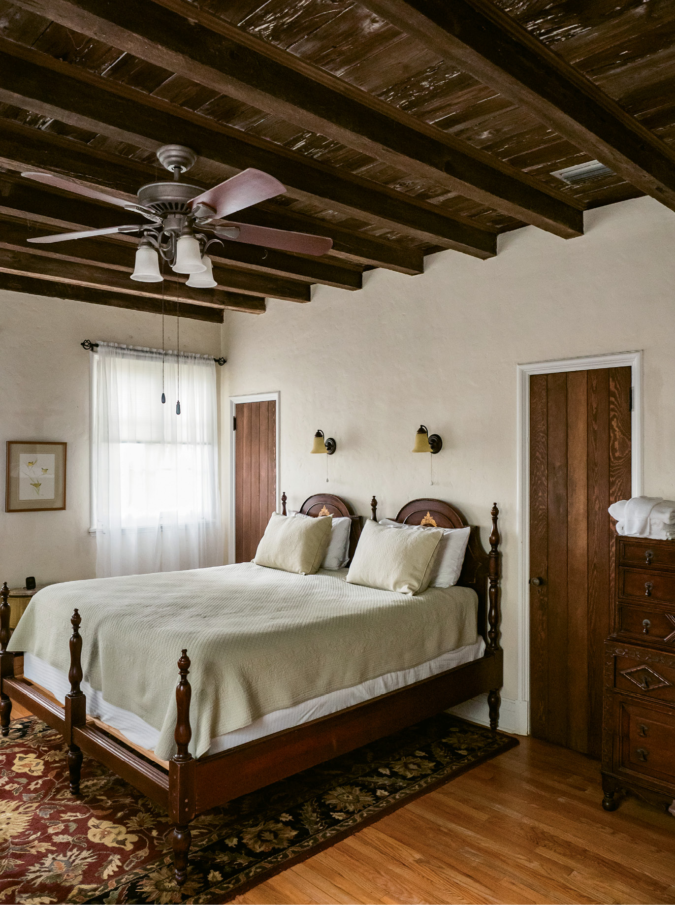A compound of houses and cottages surrounds the lodge, barn, and dock. We unpack in our room of the three-bedroom Helen House, a circa-1928 abode built with thick, oyster tabby walls, a screened porch, and a courtyard patio where I notice the brown ears of a rabbit twitch before he sees me, too, and hops off.