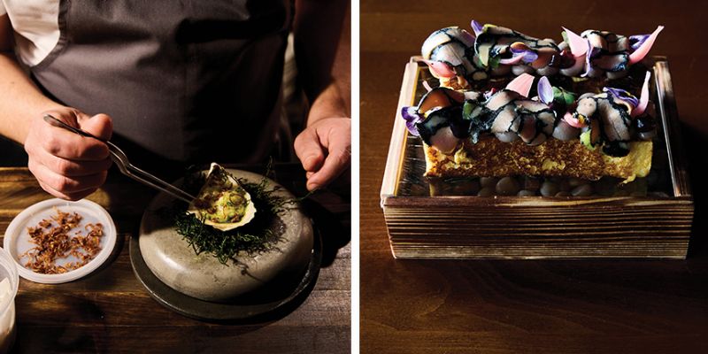 Step inside the recently opened eatery, and you’ll be struck by contemporary elements such as expansive windows, a street-view raw bar, and oyster shell light fixtures that hint at the proximity to the harbor. But even combined with new brick and gleaming wood, these don’t obliterate the historical flavor lent by authentic maps and documents depicting the area’s past, an original column from the building’s former cast-iron storefront, and art that celebrates jazz’s influence on Charleston’s history. The overall result is that of a handsome seafood house with an easy spirit and a slightly nostalgic air.