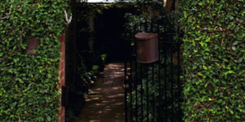 Tucked into a narrow lot along Tradd Street, the entrance garden to a one-time kitchen house mixes formal elements with...