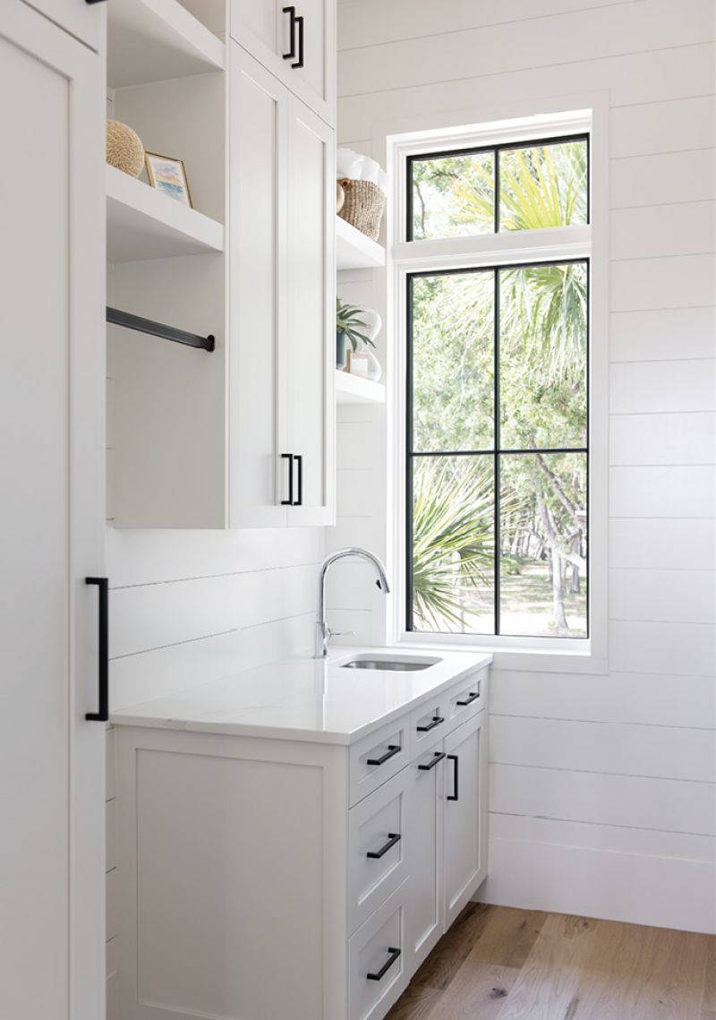 Ship to Shore: Modern, simplified shaker cabinets pair with shiplap on the island and walls to create a clean, simple look in the kitchen, pantry, and laundry room.