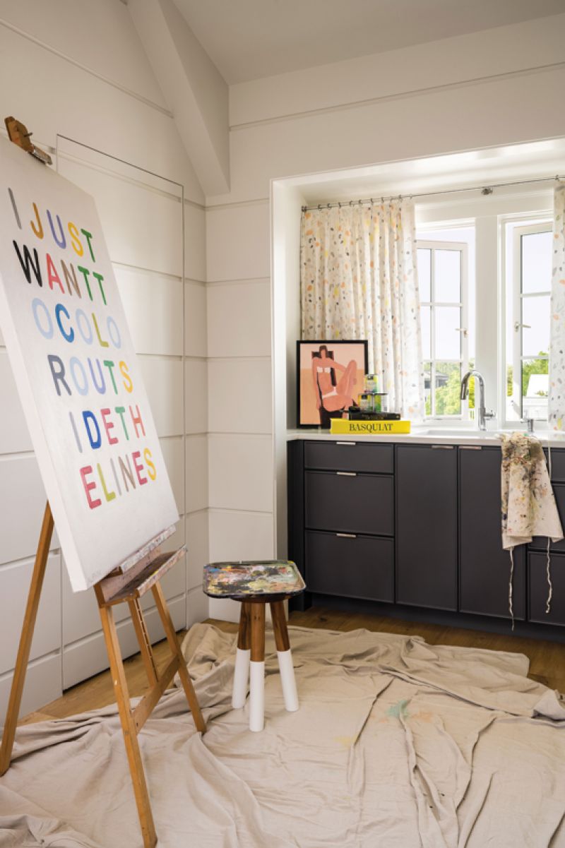 Creative Space: With no room in the floor plan for Debby’s studio, the architect cleverly transformed an open area at the top of the stairs, outfitting the window nook with cabinets and a sink. A large closet behind a jib door provides storage for canvases and a rolling cart with all her supplies.