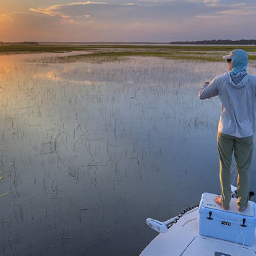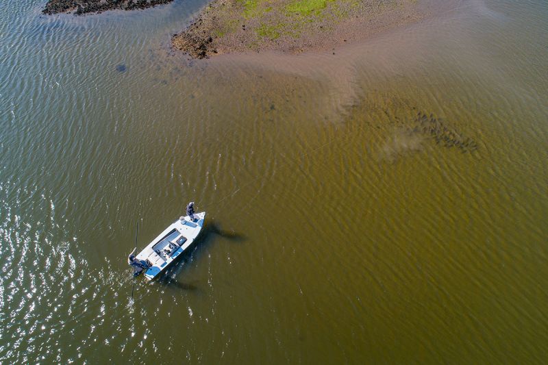 Poling the skiff and casting at low tide.