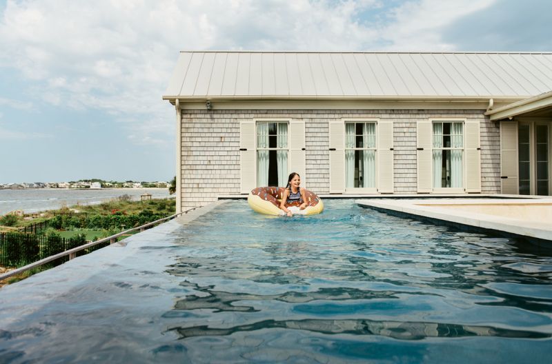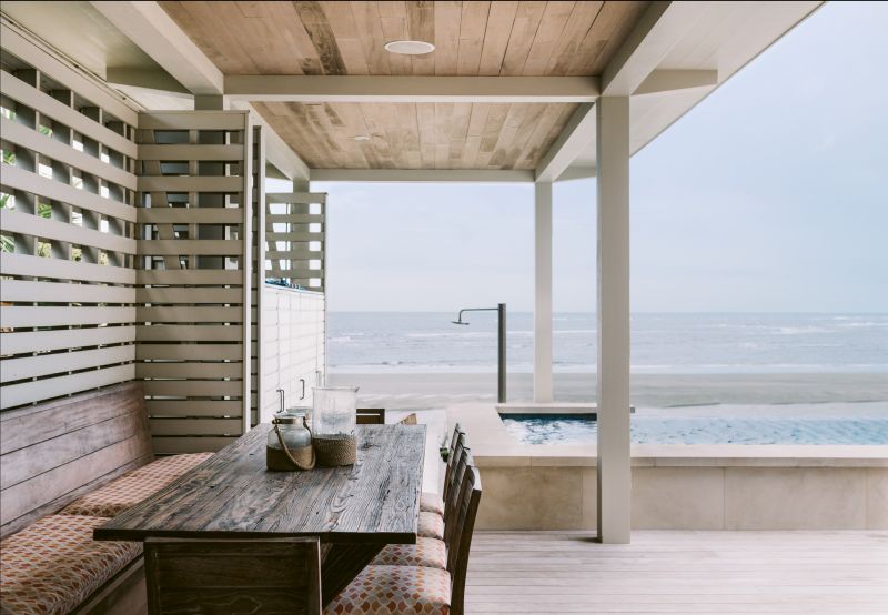 On the elevated courtyard, a slatted wall serves as a privacy screen while allowing breezes to flow through. “We eat out there as much as possible,” says Suzanne of the outdoor dining area with a large reclaimed wood table crafted by Landrum Tables. “We can enjoy a glass of wine while the kids are swimming.”
