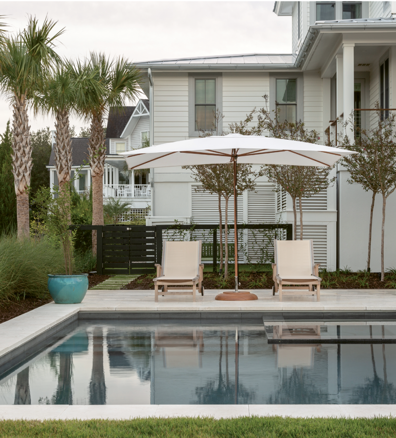 Closer to the home, teak lounge chairs from Kingsley Bate’s St. Tropez collection are sheltered by a white canvas Tucci umbrella.