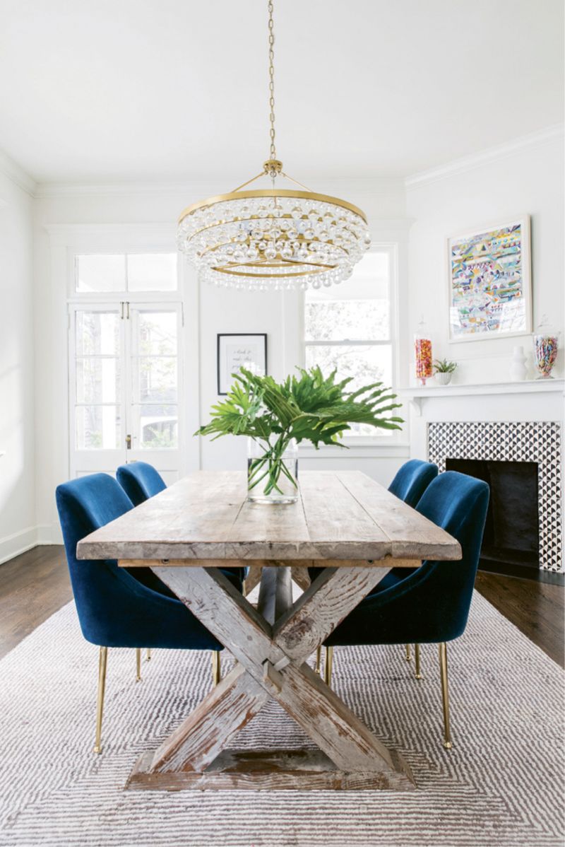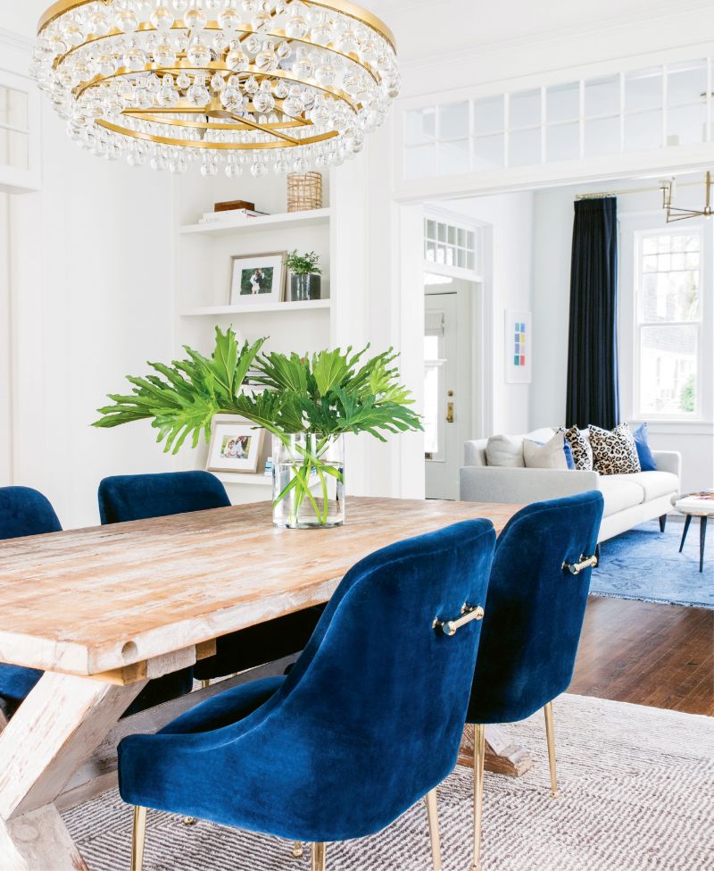 The luxe theme flows into the adjoining dining room thanks to velvet-covered chairs from Anthropologie and a Robert Abbey chandelier.