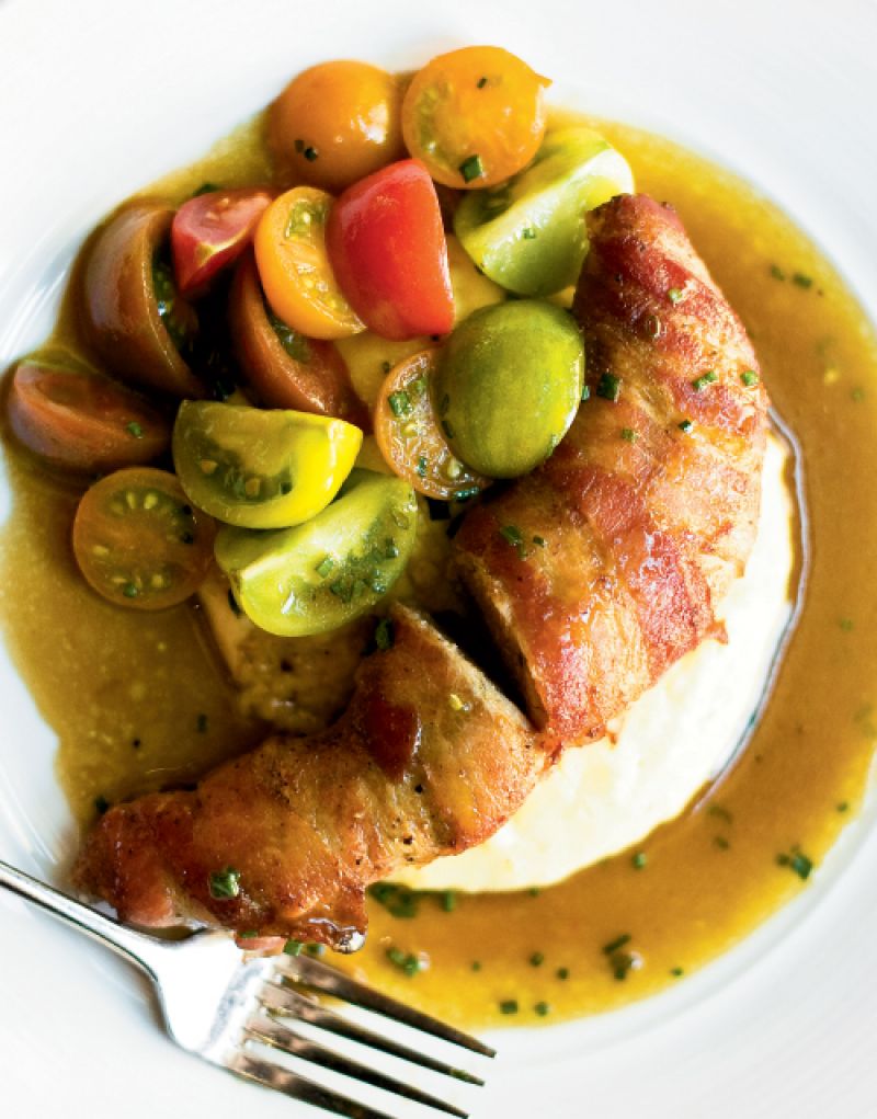 Bacon-Wrapped Shad Roe with Anson Mills Polenta & Heirloom Tomato Salad