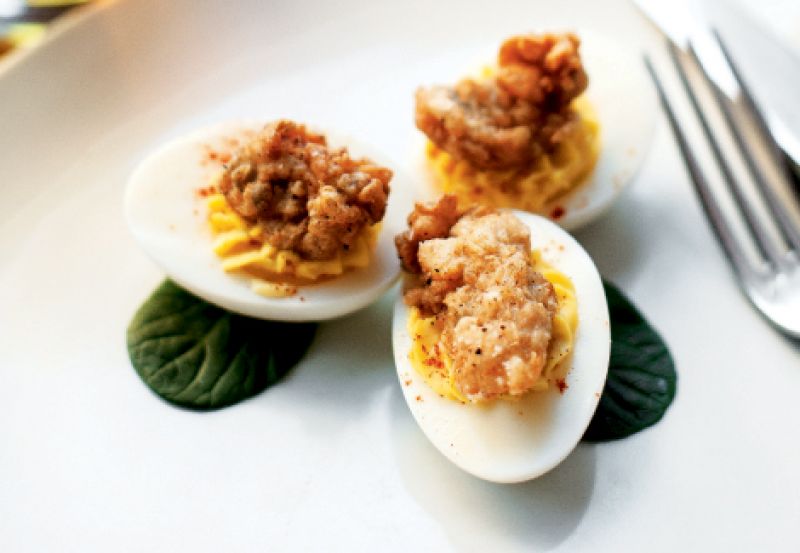 The Macintosh chef Jeremiah Bacon delivers a soft and crunchy combo in hard-boiled eggs topped with fried oysters