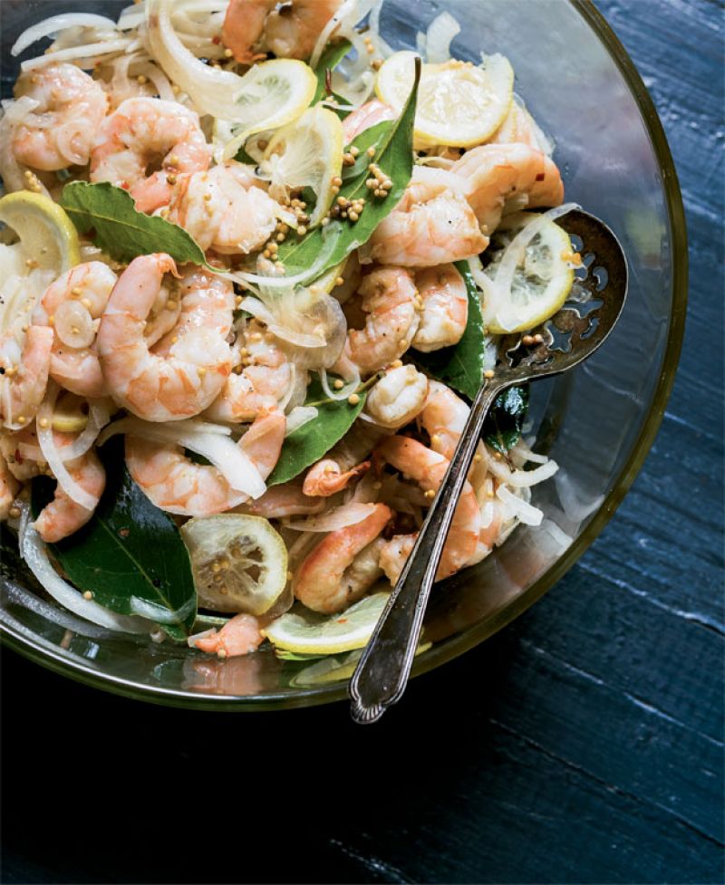 In a crock, put a layer of boiled shrimp, a layer of bay leaves (about 5 to a layer), and a layer of very thin sliced onions. Alternate until all shrimp are used. Make a French dressing (vinaigrette) of the other ingredients and pour over shrimp, etc. Cover and put in the refrigerator for 24 hours, stirring occasionally. Serve with toothpicks in a bowl over ice for a cocktail party or as a salad with lettuce.